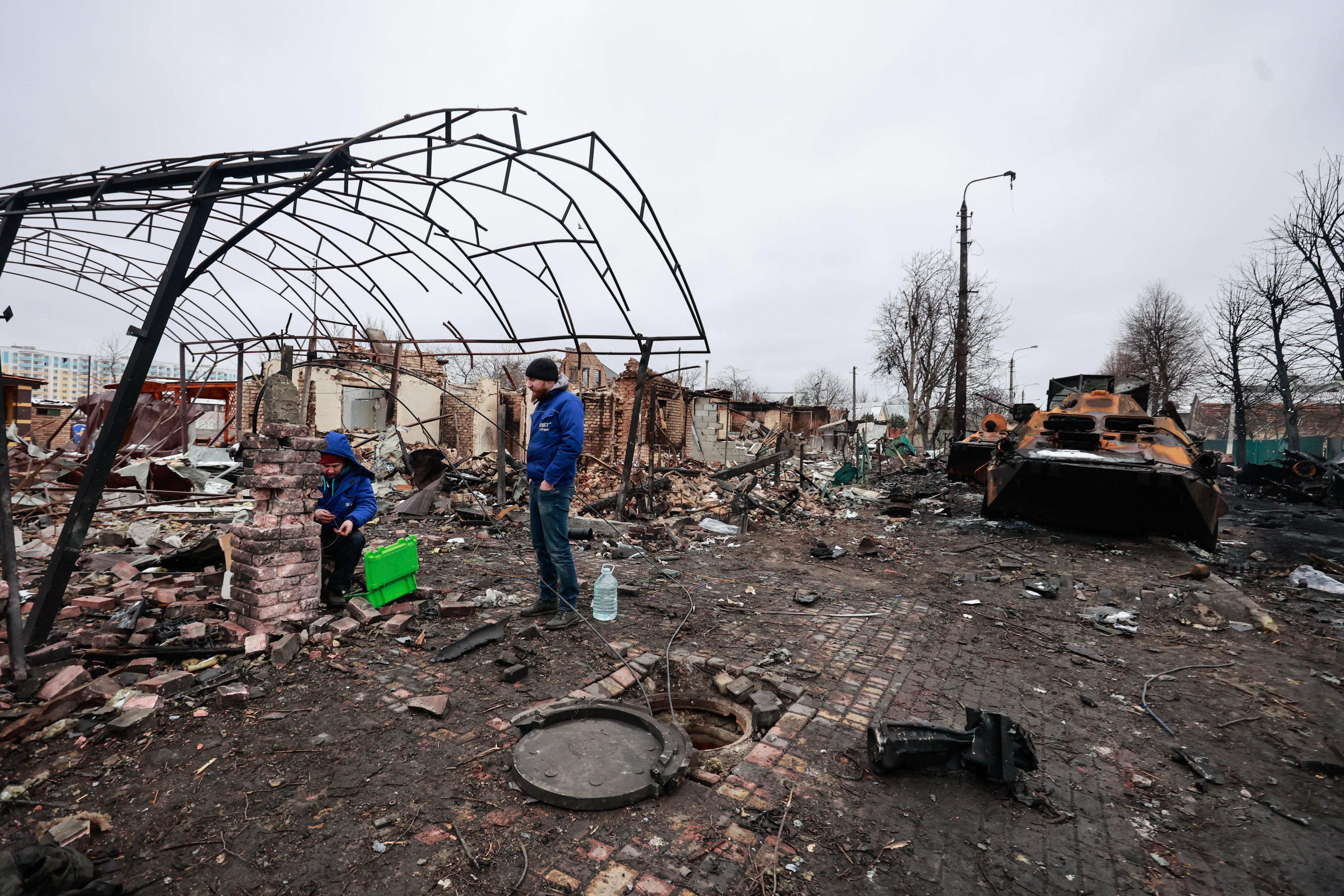 Fig. 1. Repair brigades are trying to restore the internet connection in the city of Bucha, the Kyiv region. March 1, 2022.Photo: Serhii Nuzhnenko (Radio Free Europe/Radio Liberty) / the Collection of war.ukraine.ua